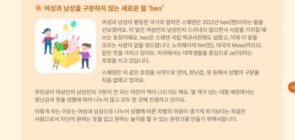 최근 온라인에서 공유되고 있는 '성평등가족부 홈페이지'내 어린이 교육 자료가 논란을 낳고 있다. 해당 자료는 “여성과 남성을 구분하지 않는 새로운 말 ‘hen’”이라는 제목으로, 스웨덴 등에서 사용되는 중성적 호칭을 긍정적으로 소개하고 있다. 포스터는 이를 “성평등한 사회의 상징”으로 묘사하며, 어린이 책과 장난감, 의류에서도 성별 구분을 없애는 시도를 소개한다.