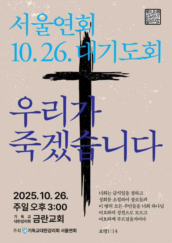 기독교대한감리회 서울연회가 오는 10월 26일(주일) 오후 3시, 금란교회에서 '우리가 죽겠습니다'라는 주제로 대기도회로 모입니다. 이번 기도회는 감리회 선교 140주년을 기념하며, 스크랜턴 선교사의 헌신과 희생을 되새기고 한국 교회의 새로운 부흥을 위한 회개와 갱신을 다짐하기 위해 준비됐습니다.