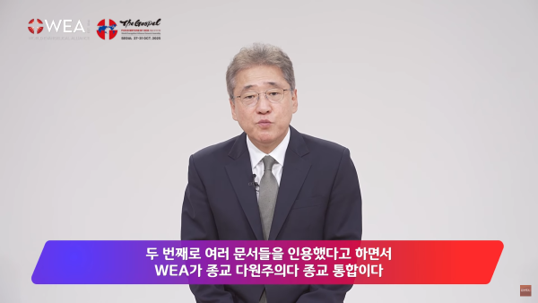 그리고 문병호 교수는 WEA 내부 문건과 국제적 활동을 분석하며 종교다원주의 수용 경향, 카톨릭과의 연합 강행, 신사도 운동 지도자들과의 협력 등을 근거로 들며 “이는 단순한 음모론이 아니라 실제 보고·문서로 확인 가능한 사실”이라고 밝혔다.