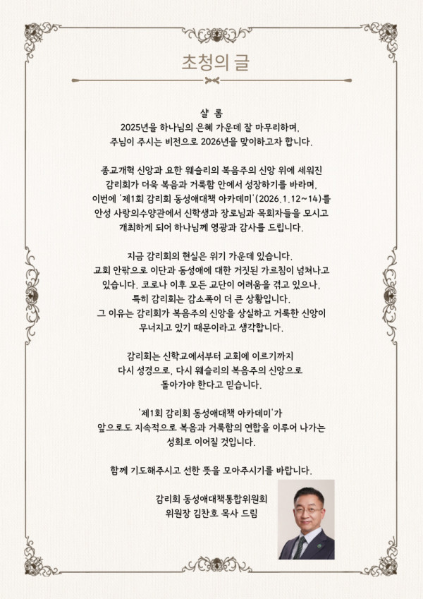 감리회 동성애대책통합위원회 주관으로 2026년 1월 12(월)-14(수)까지 개최한다.