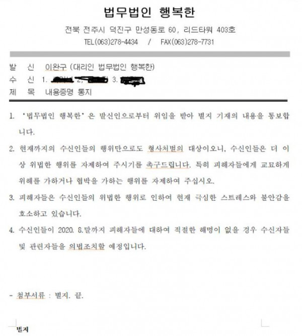 간사들과 장로들의 갑질을 더 이상 방치했다가는 사모님에게 큰 일이 나게 생겼길래 저는 너무나 걱정이 되었습니다. 그래서 보다 못해 변호사 사무실을 통해서 간사들에게 내용증명서를 보냈습니다.