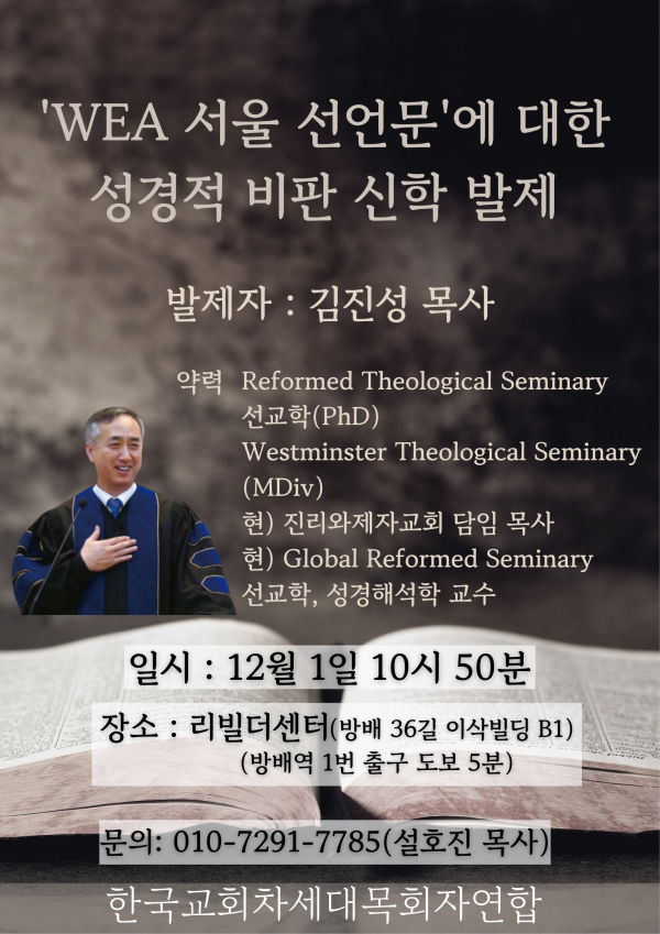 한국교회차세대목회자연합(대표 크리스 강 목사, 이하 한차목)이 1일 오전 10시 방배동 리빌더센터에서 'WEA 서울선언문에 대한 성경적 비판' 바이블 세미나를 개최하고, WEA가 지난 10월 30일 서울에서 발표한 선언문이 성경의 절대적 진리를 왜곡하고 종교개혁의 핵심 정신을 부정하고 있음을 밝혔다.